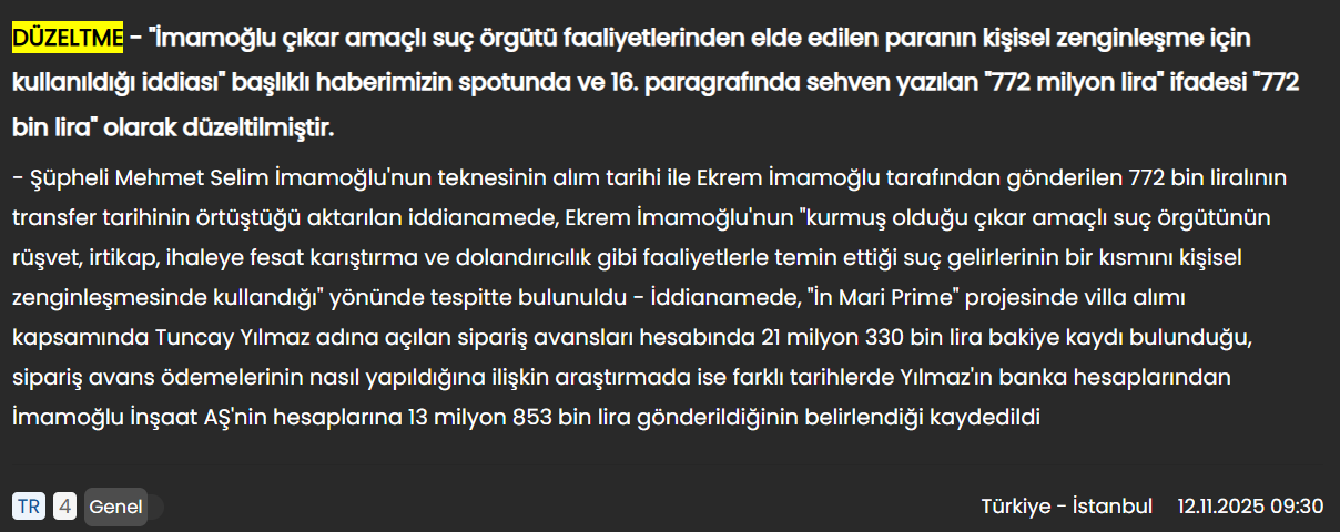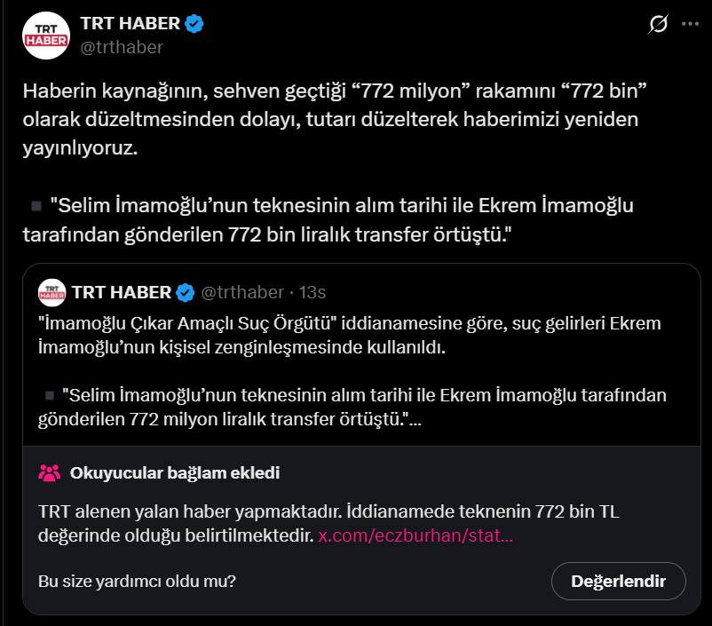 İktidara yakınlığıyla bilinen Anadolu Ajansı, Ekrem İmamoğlu'nun oğlu Selim İmamoğlu'na "772 milyon liralık para transferi" haberini yaklaşık 12 saat sonra "772 bin lira" düzeltti. Düzeltmenin ardından haberi web sitesinde değiştiren TRT Haber, yanlış bilginin yer aldığı X gönderisini ise uzun süre kaldırmadı.