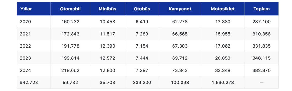 Türkiye’de 2020-2024 döneminde motorlu taşıtların bazılarının katettikleri yollar şöyle (milyon kilometre):